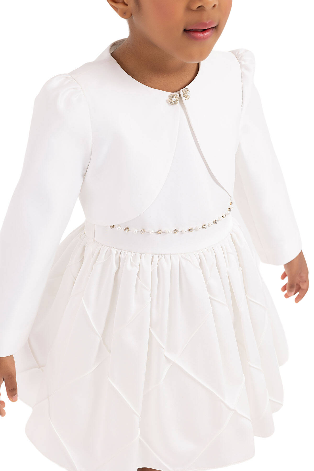 البوليرو الفتاة بأكمام طويلة وتفاصيل التجميع عند الكتف هو الإضافة الأنيقة المثالية سواء للأيام الخاصة أو للملابس اليومية. يتميز البوليرو بياقة أمامية مزودة بخطاف وزر، مزخرف بأشكال لؤلؤية وحجرية على شكل زهور تضفي عليه بريقًا خاصًا. بطانته القطنية ناعمة ومريحة للارتداء.