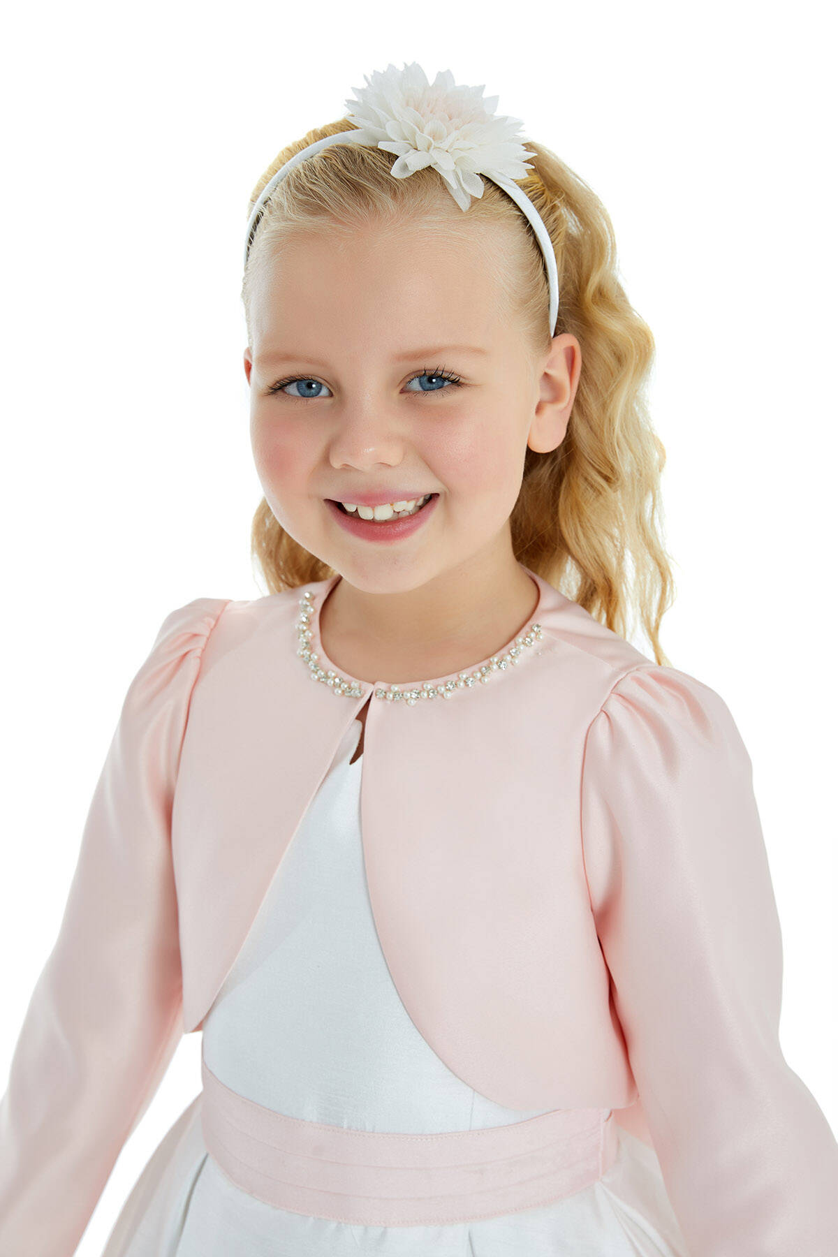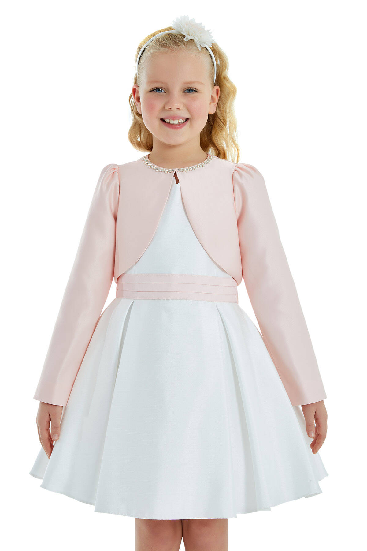 النسيج الرئيسي: 100% بوليسترالمنقذ للأمسيات الصيفية الأنيقة هو، بالطبع، بوليرو أنيق. ستُكمل الأميرات الصغيرات أناقة فساتينهن بدون أكمام أو بدون حمالات ببوليرو من الساتان المطرز باللؤلؤ والأحجار. يتوفر هذا البوليرو بلونين، الكريمي والوردي.