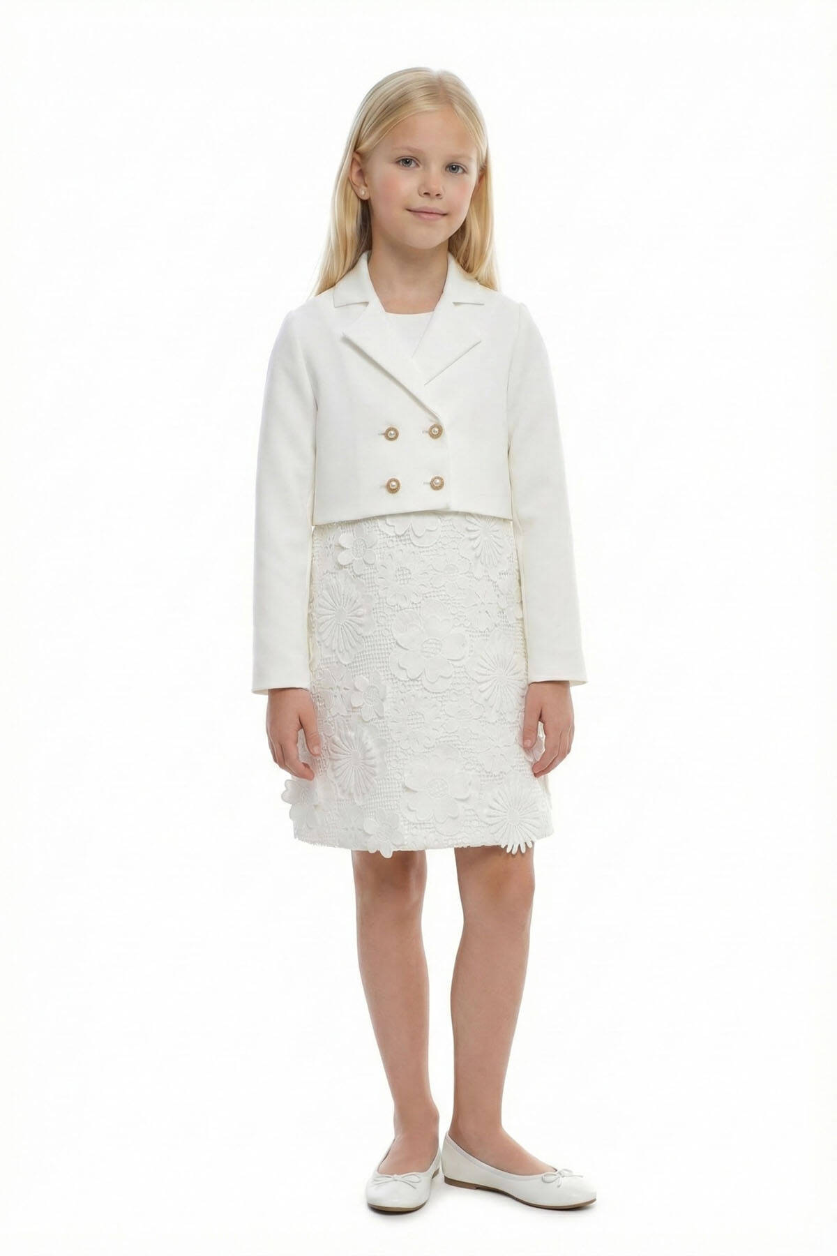 كلاسيكي عصري للبنات الأنيقات. طقم أنيق مكوّن من فستان ناعم من الدانتيل الزهري مع سترة متناسقة، تصميم مميز يجمع بين الرقي والبساطة ليمنح إطلالة أنثوية راقية مناسبة للمناسبات والأعياد والاحتفالات العائلية.