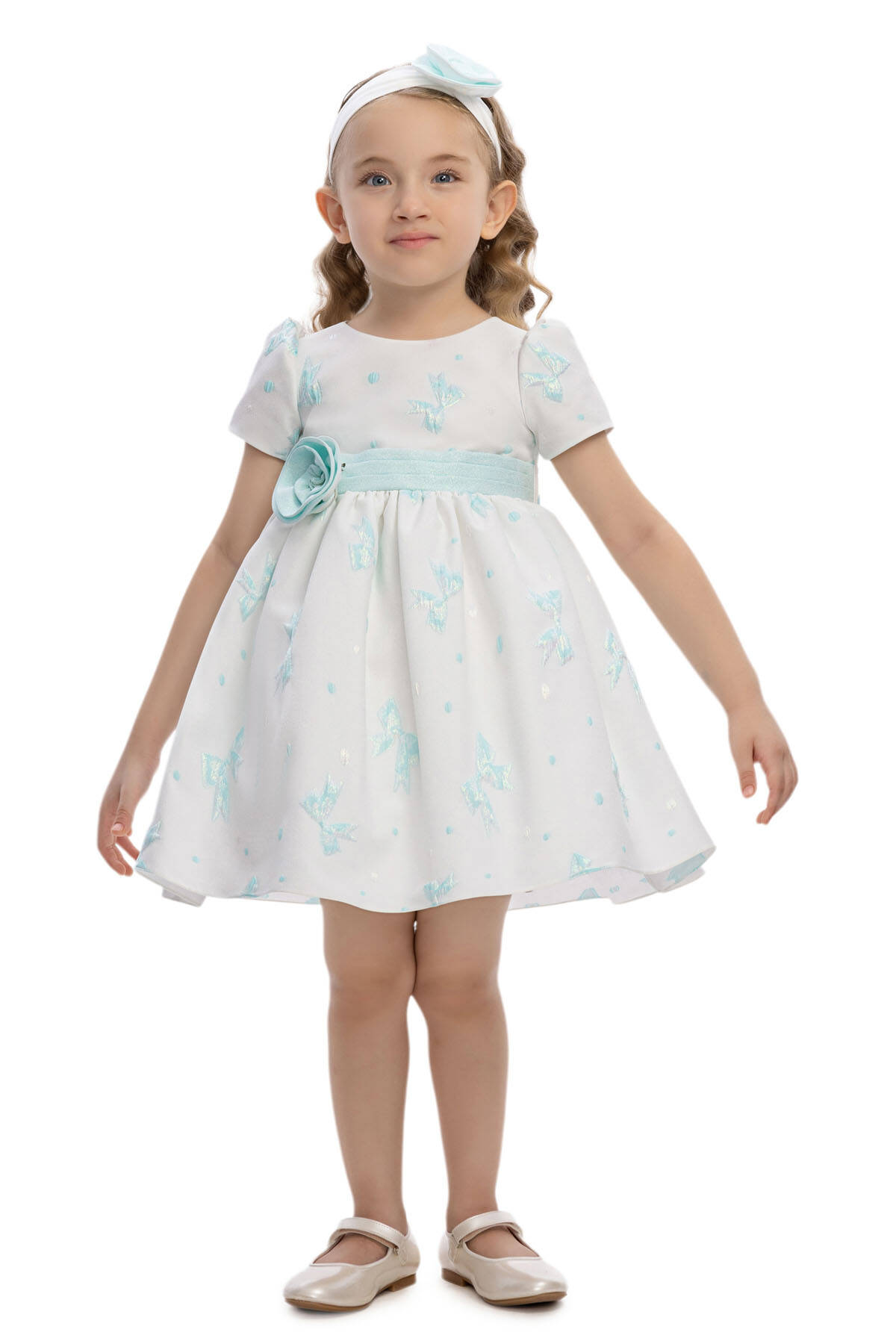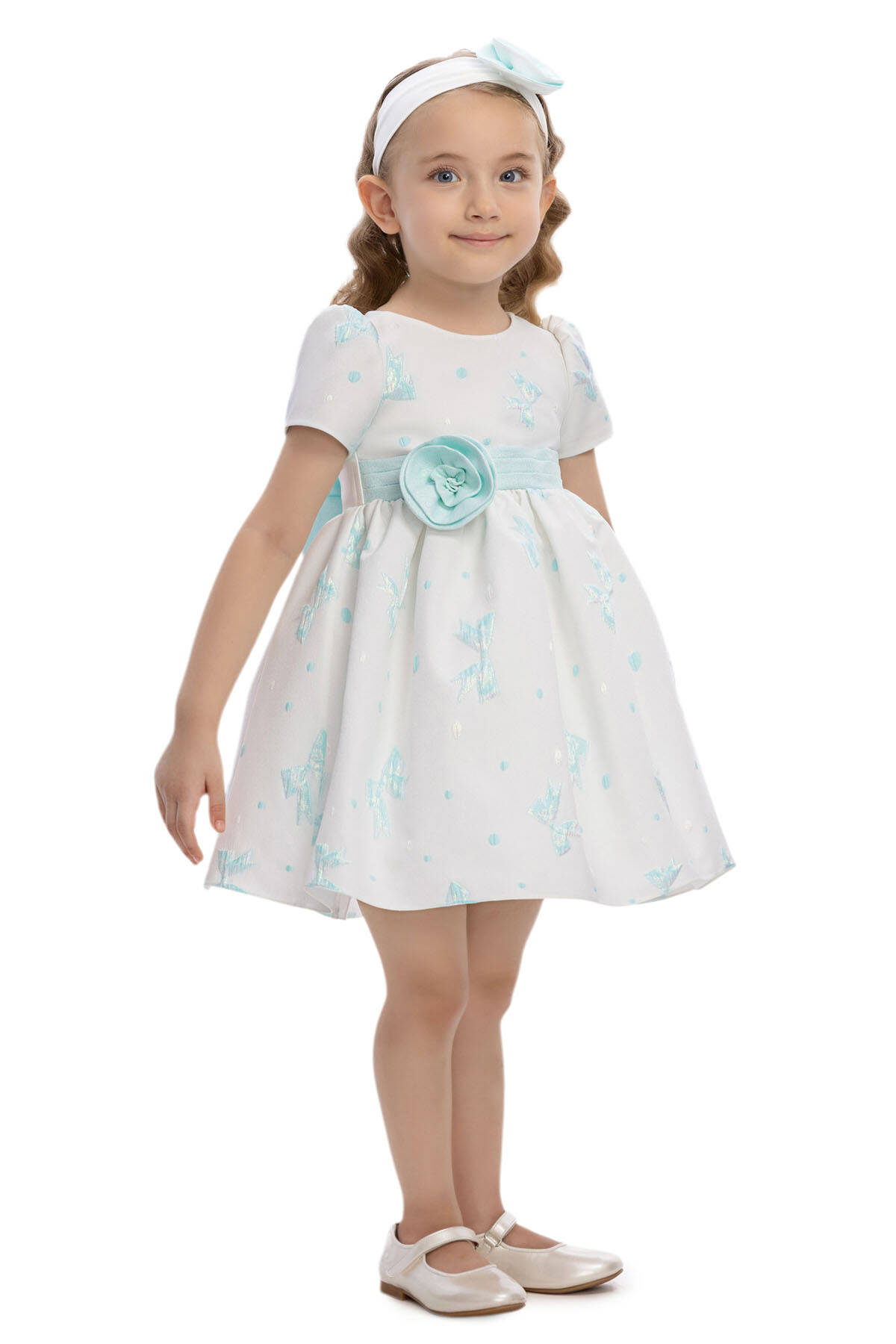 هذا الفستان الرقيق والأنيق للأطفال مُصمم للمناسبات التي لا تُنسى. القماش الجاكار مزين بزخارف أقواس متلألئة ونقاط بولكا دقيقة، مما يضيف ملمسًا مرحًا وأنيقًا في آن واحد. يبرز حزام الخصر العريض مع زينة من زهرة قماشية منطقة الخصر، بينما يُختتم الجزء الخلفي بقوس كبير الحجم لمزيد من الجاذبية. الأكمام القصيرة المنفوخة والتنورة المتسعة تخلقان شكلًا كلاسيكيًا خالدًا، في حين يُكمل رباط الرأس المتناسق مع تفصيل زهرة مظهر الفستان. مثالي لأعياد الميلاد، والتجمعات العائلية، أو الاحتفالات الخاصة، هذا الفستان يضمن لطفلك مظهرًا أنيقًا ومريحًا.