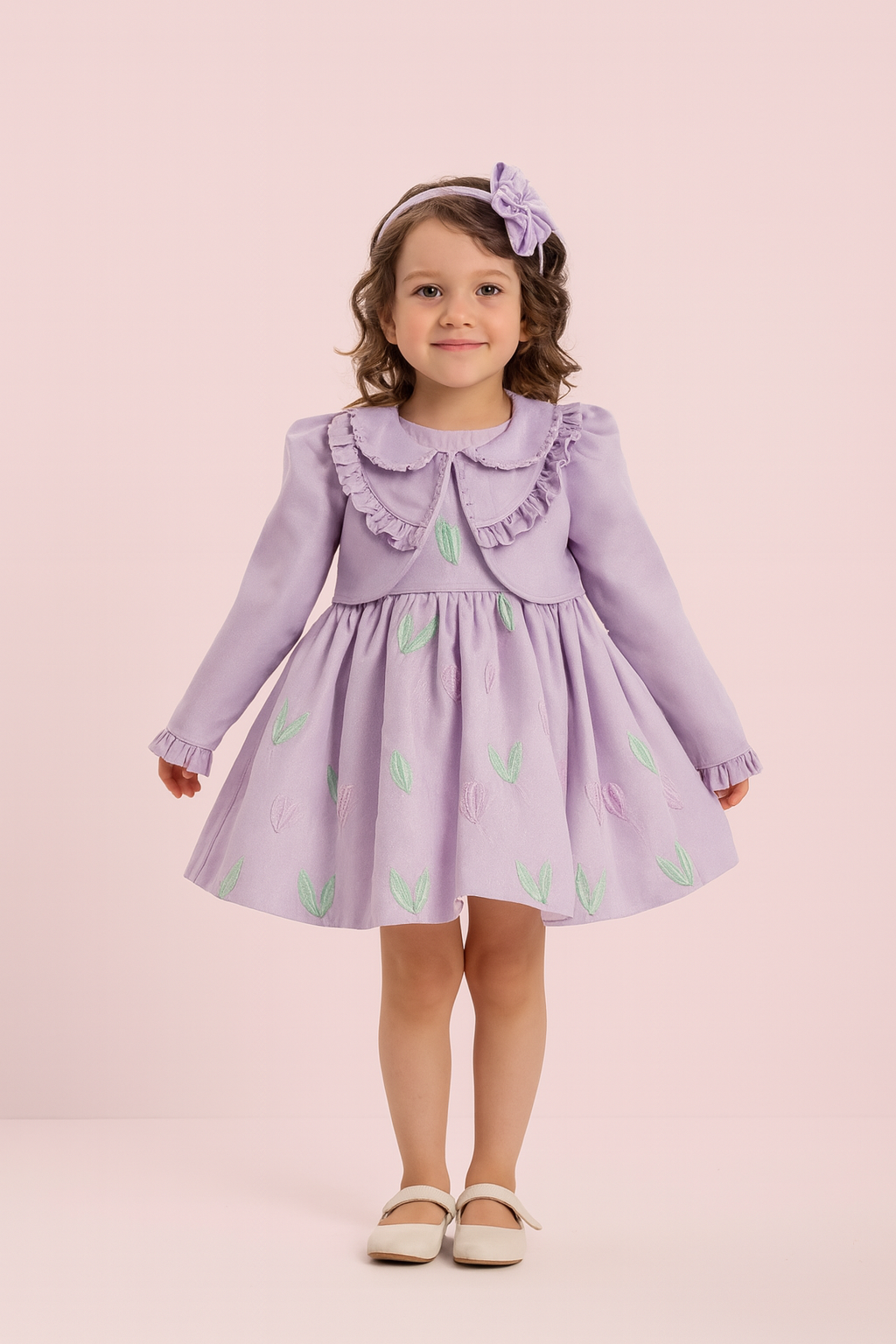 فستان أطفال ليلكي مع تفاصيل قلوب وجاكيت انيق ورباط رأس ٦-٢٤ شهر