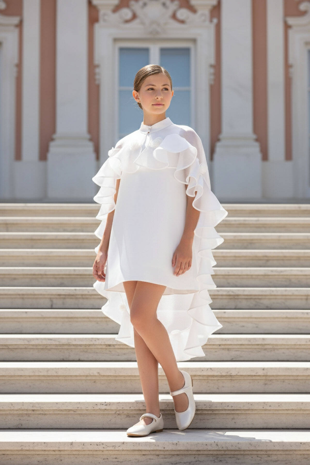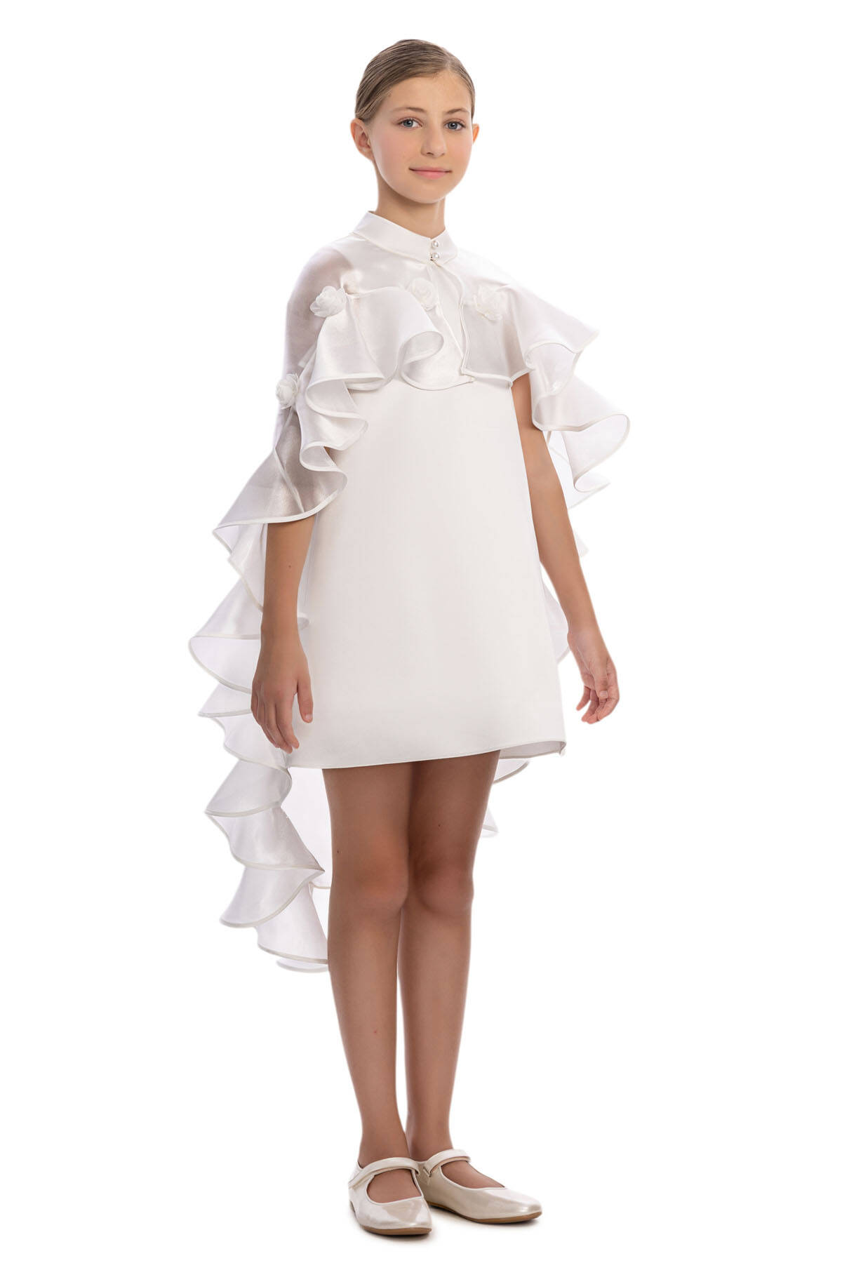 فستان الفتيات بكاب مكشكش بلون الإكرو للأعمار من 8 إلى 14 سنة
