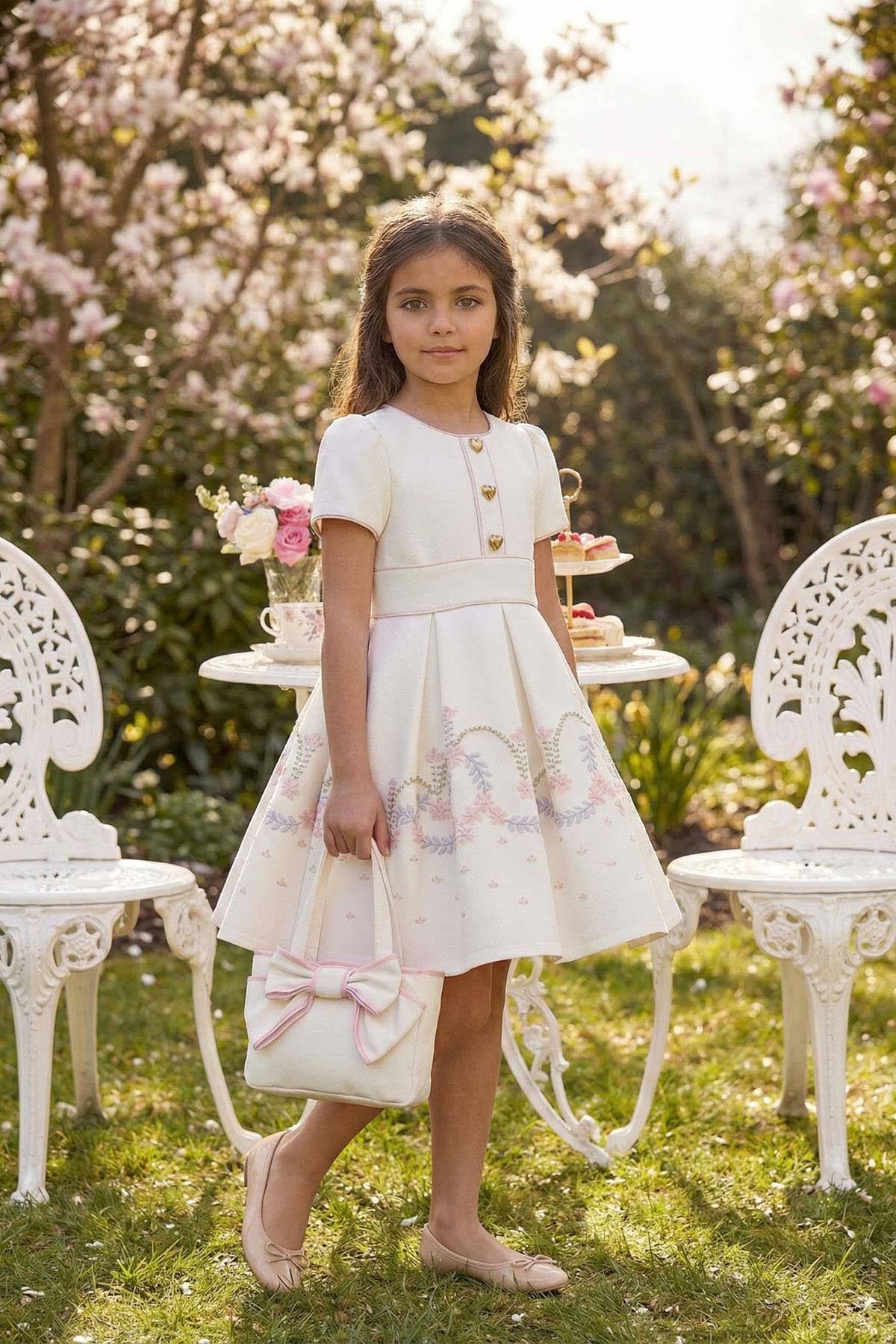 فستان بنات أنيق ومريح مزين بتطريزات زهرية جميلة وأزرار على شكل قلب تضفي لمسة من البراءة والأنوثة. يأتي مع حقيبة مطابقة تضيف لمسة عملية وعصرية تناسب الفتيات من عمر 3 إلى 7 سنوات.