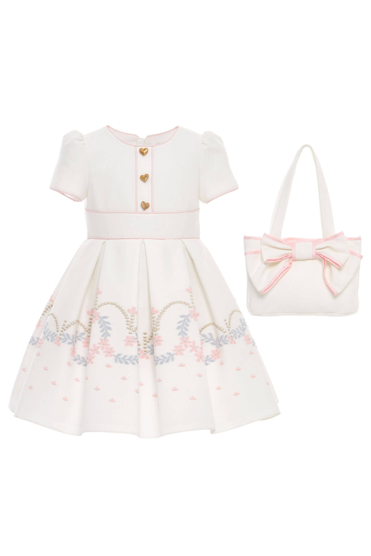 فستان بنات بودر المطرز بالزهور مع أزرار على شكل قلب وحقيبة مطابقة للأعمار من 3 إلى 7 سنوات