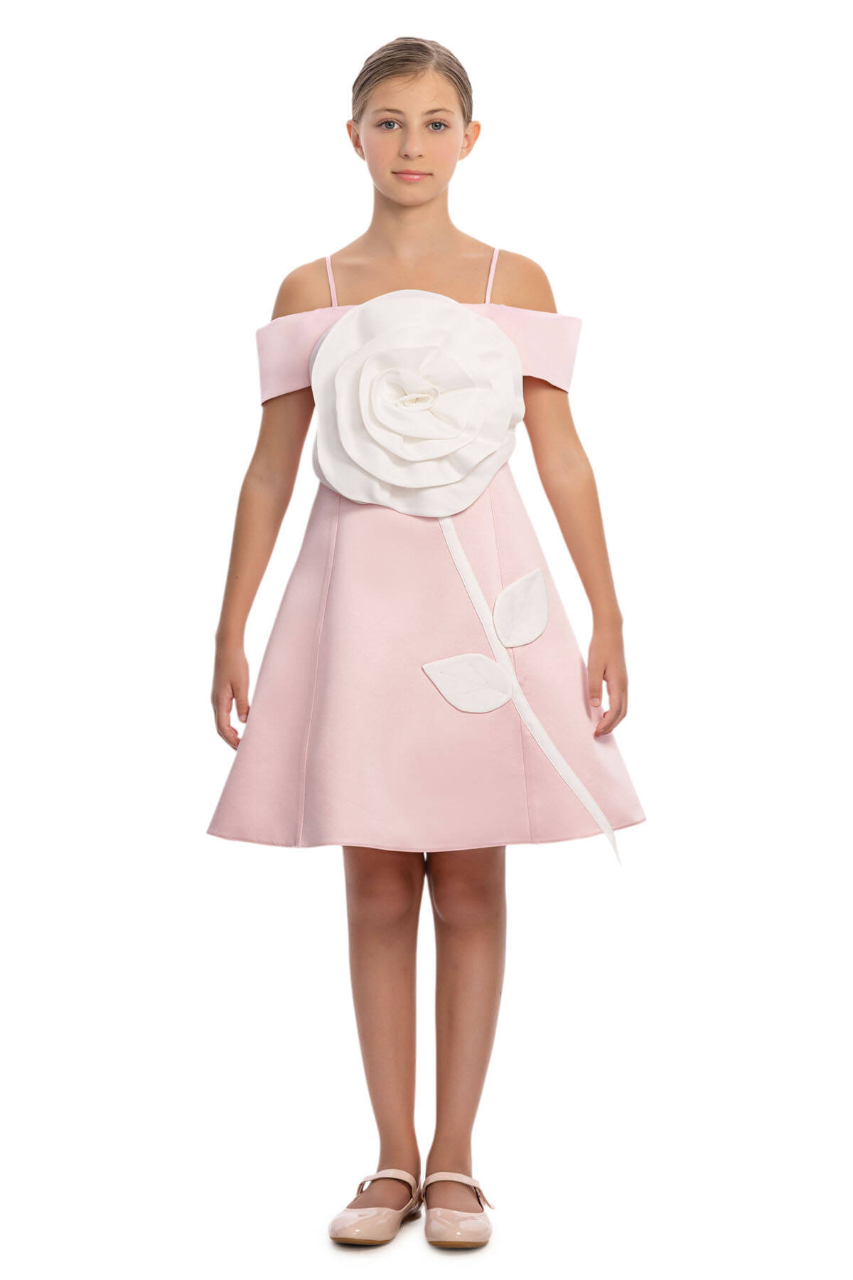 فستان البنات بلون الإكرو مع تفاصيل وردية ثلاثية الأبعاد للأعمار من 8 إلى 15 سنة