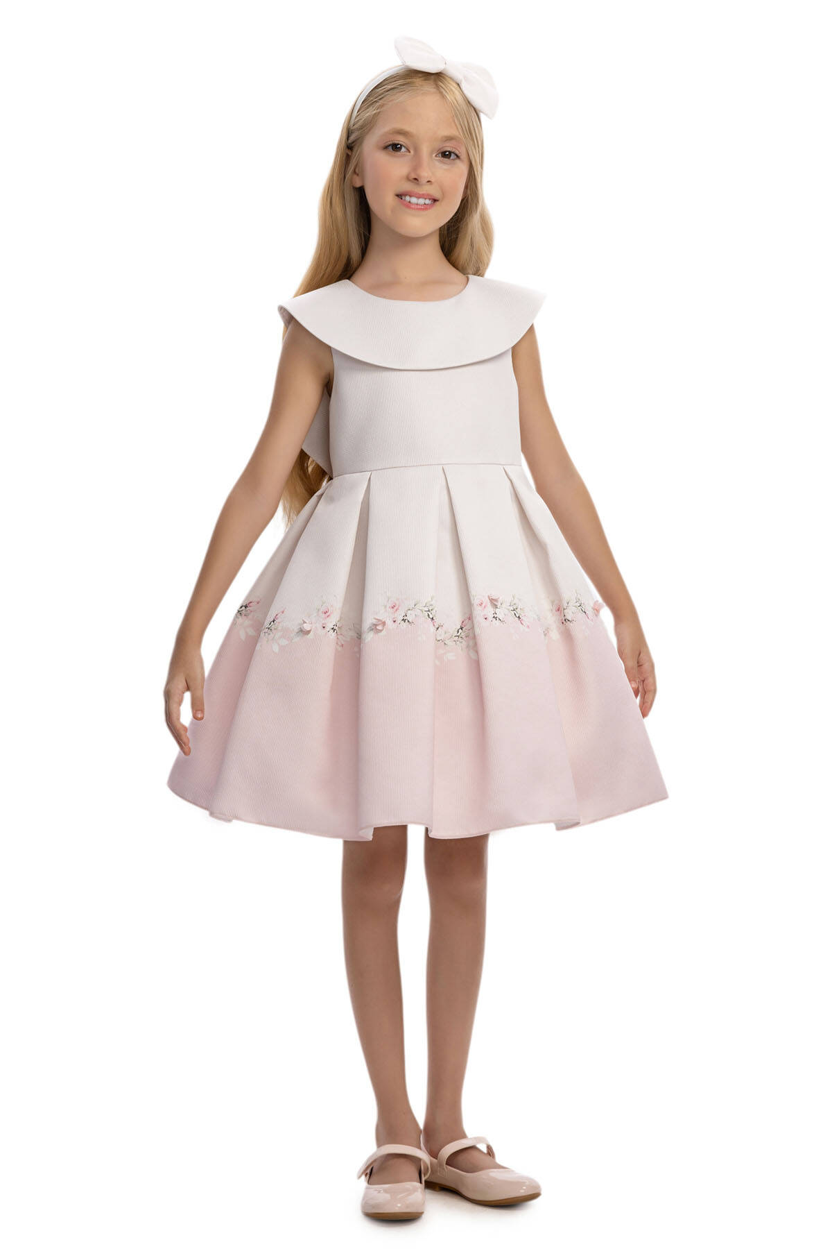 فستان ناعم وأنيق صُمم ليجعل فتاتك الصغيرة تشعر وكأنها أميرة. يتميز بقصة على شكل حرف A مزينة بطيات ناعمة وياقة عريضة لإطلالة راقية. يضفي الطرف المزهر الحالم، المزخرف بتطريزات زهور ثلاثية الأبعاد دقيقة، لمسة رومانسية. في الخلف، تكمل فيونكة كبيرة بارزة المظهر، بينما تضمن ربطة الرأس المطابقة تنسيقًا مثاليًا. بفضل التنورة المتسعة والبطانة القطنية الناعمة، يجمع هذا الفستان بين الراحة والأناقة، مما يجعله مثالياً لأعياد الميلاد، حفلات الزفاف، والمناسبات الاحتفالية.