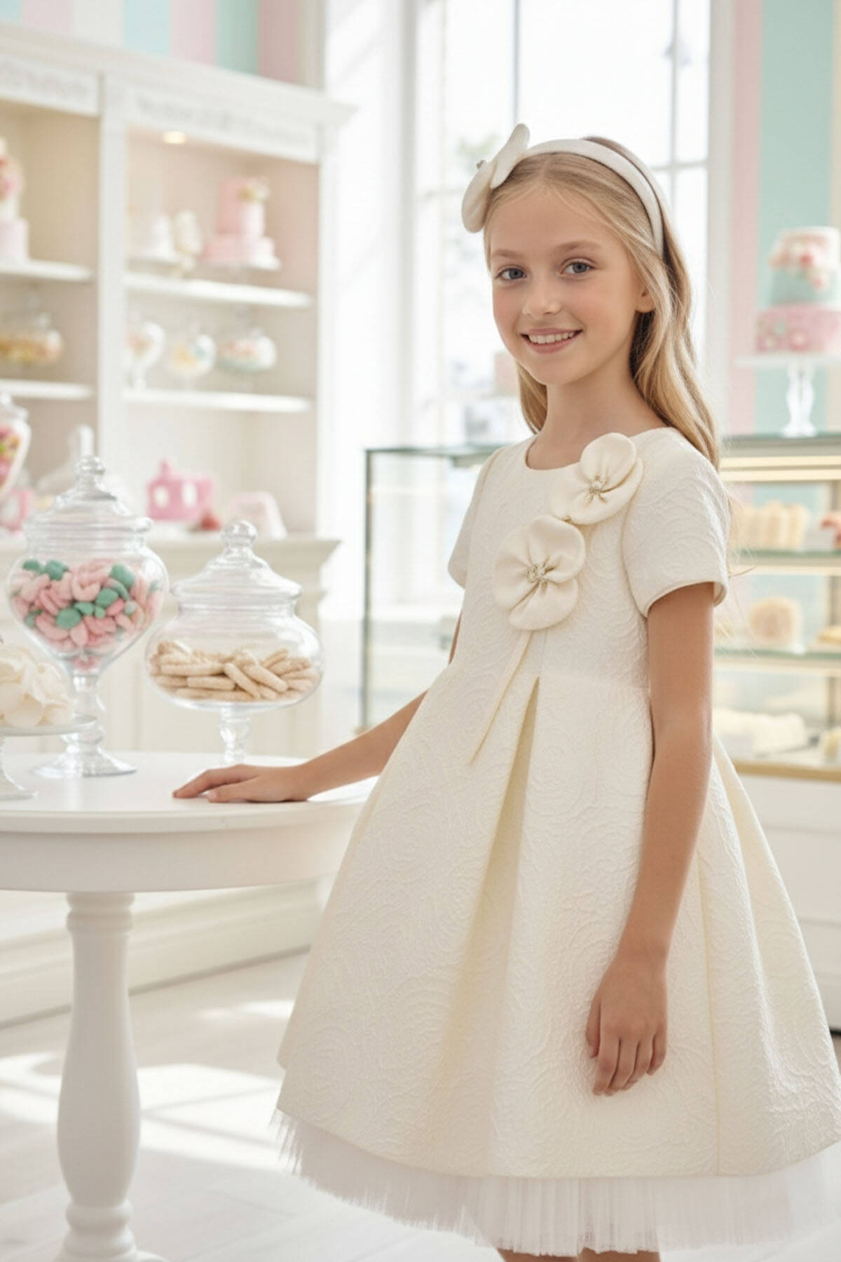 هذا الفستان الجاكار هو قطعة خالدة صُممت لتجعل الفتيات الصغيرات يشعرن بتميز خاص. القماش الأنيق ذو النسيج المحكم يتناغم مع قصة كلاسيكية على شكل حرف A وطبقة داخلية من التول الناعم التي تضيف حجمًا رشيقًا مع كل دوران. زين الفستان بتطريزين كبيرين ثلاثيي الأبعاد على الصدر مع عصابة رأس مزينة بأزهار متناسقة، مما يخلق مظهرًا لطيفًا ومنسقًا. بأكمام قصيرة منتفخة وياقة دائرية، يجمع هذا الفستان بين الرقي والسحر المرح، وهو مثالي لأعياد الميلاد والحفلات والأعراس والمناسبات الاحتفالية. وبفضل بطانته القطنية الناعمة، يضمن راحة طوال اليوم مع الحفاظ على مظهر أنيق وراقي.