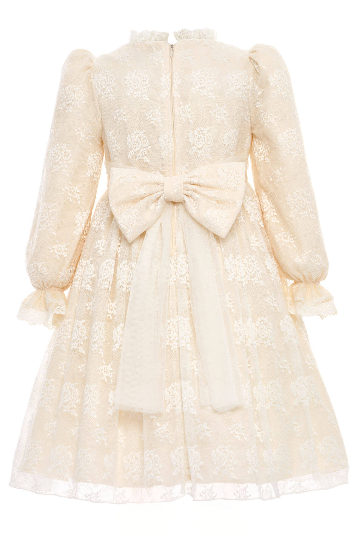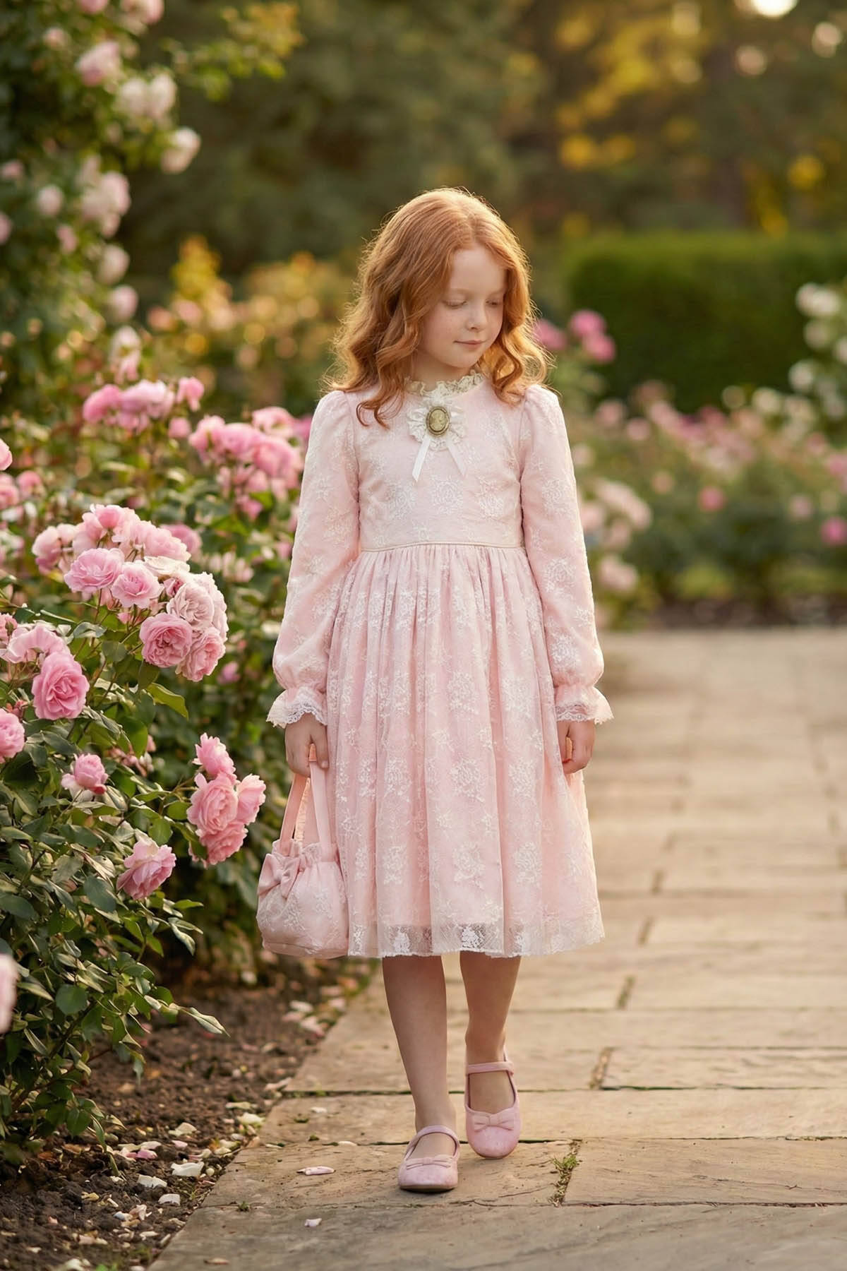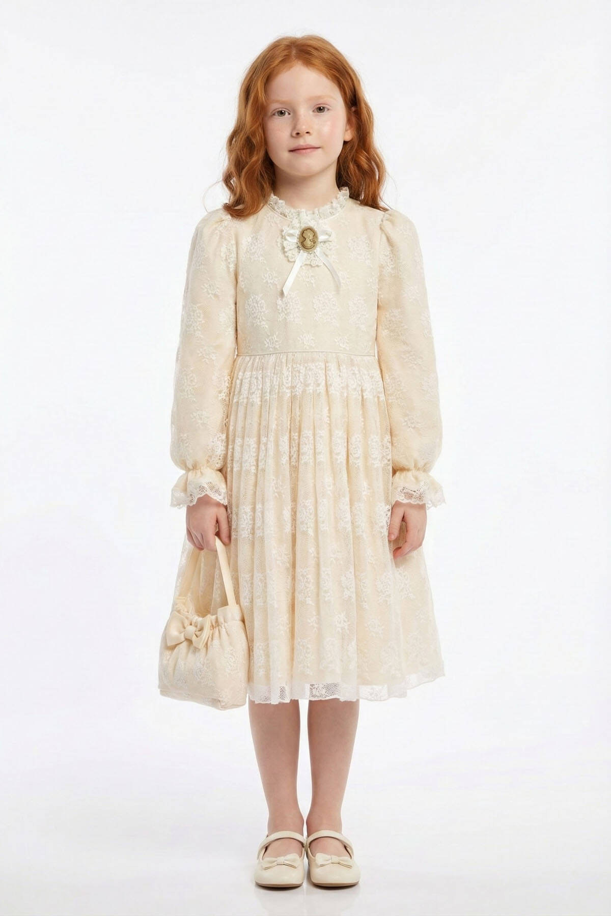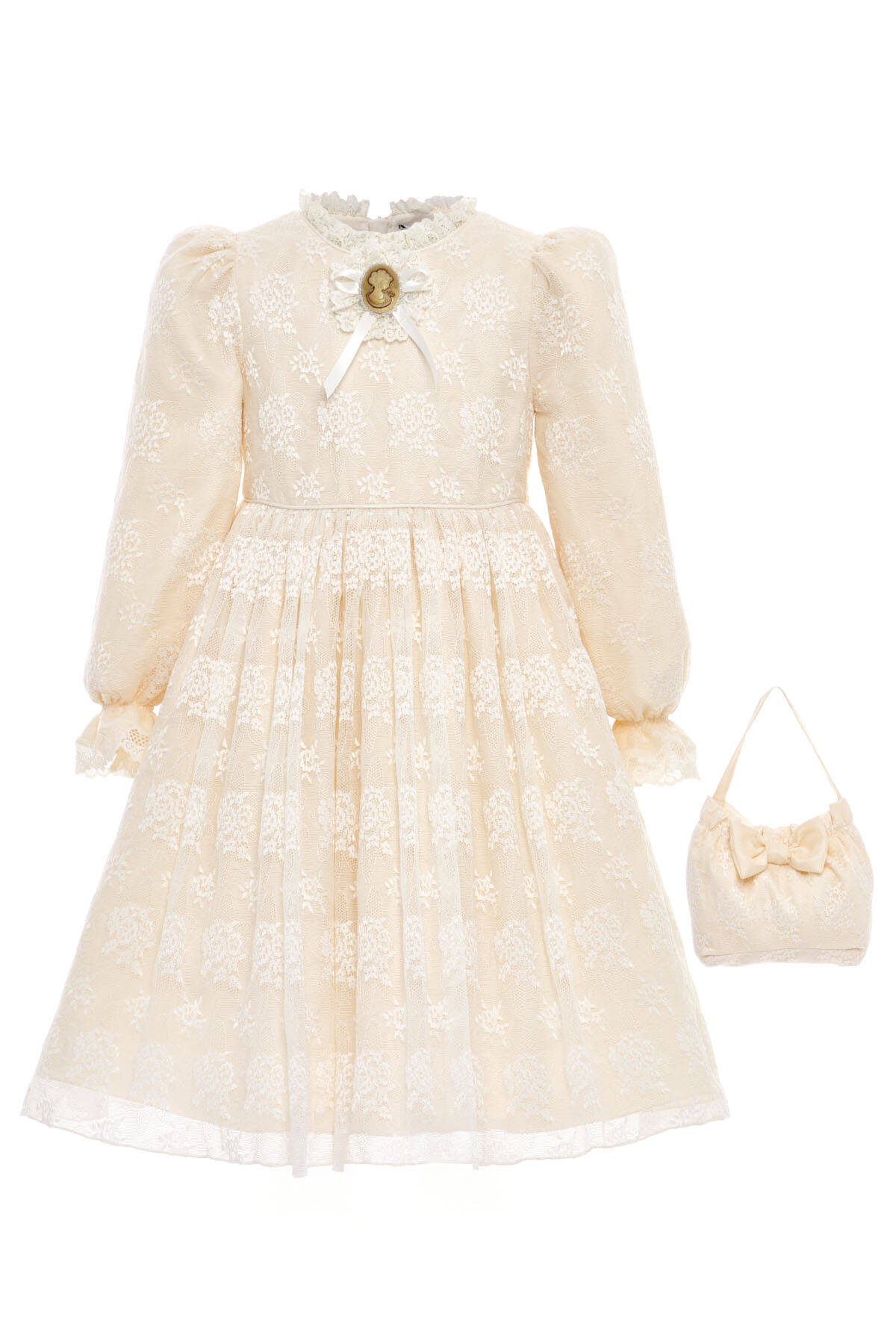 خيار أنيق وساحر للفتيات الصغيرات اللواتي يعشقن الأناقة الكلاسيكية. يتميز هذا الفستان بأكمام طويلة من الدانتيل الزهري وبطانة قطنية ناعمة لتوفير الراحة طوال اليوم. يبرز التصميم المستوحى من الطراز الكلاسيكي بأناقة راقية، بينما تضيف الفيونكة الكبيرة في الخلف لمسة جذابة ومميزة. تأتي كل قطعة مع حقيبة صغيرة متناسقة تضيف سحراً إضافياً وتكمل الإطلالة.