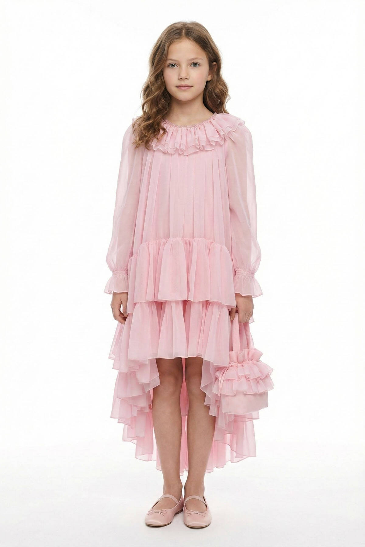 - فستان شيفون بحافة اكمام طويلة وطبقات مع كشكش عالية ومنخفضة