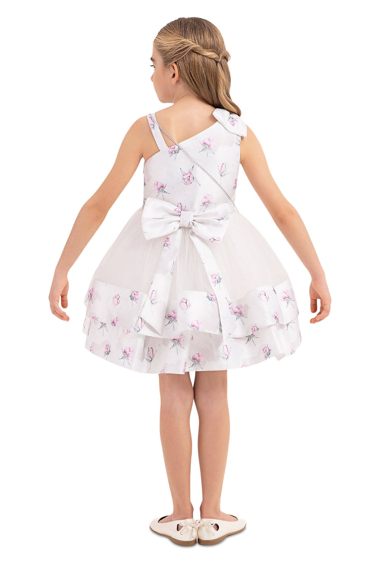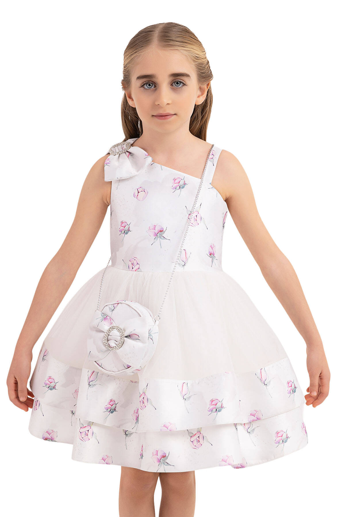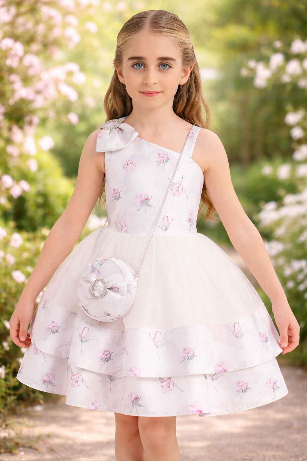 فستان بناتي بتفاصيل متعددة الطبقات، مزين فيونكة على الكتف وحزام على الخصر، يتميز بنقشة ناعمة بزهور، وهو من أكثر التصاميم المميزة للأطفال لإطلالة أنيقة تناسب جميع المناسبات.