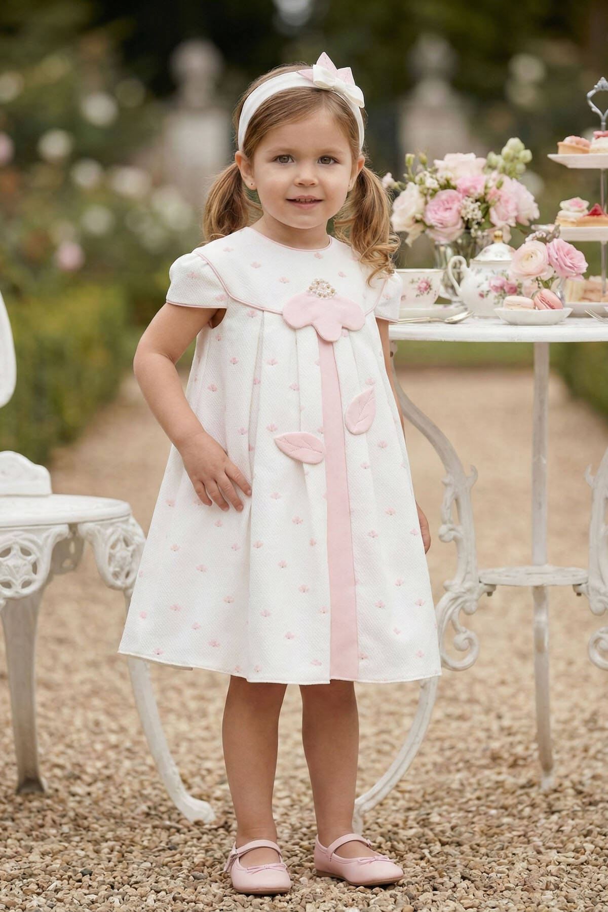 فستان وردي مع رباط رأس للبنات الرضع باللون الكريمي 6-24 شهر